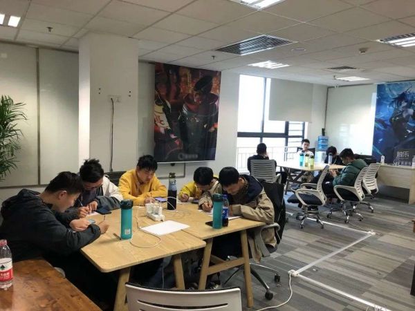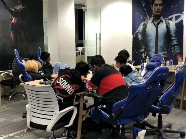图为另一间教室的《和平精英》训练班,大多数时候,学生都围坐在桌子旁边,一把打完接着一把