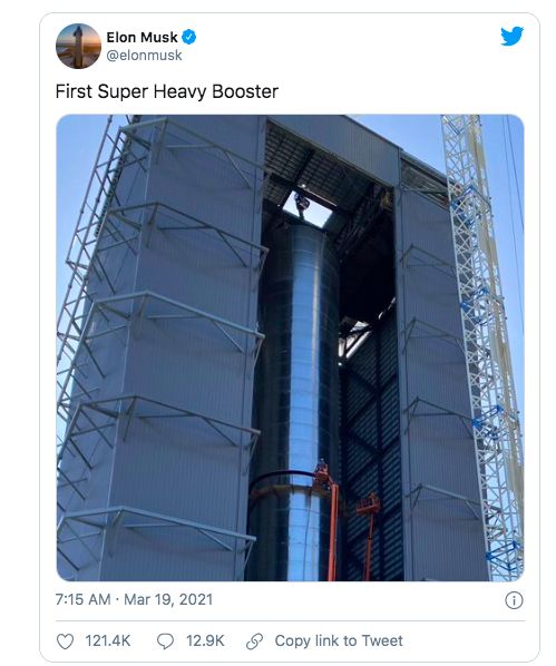 发射之前,一边 SN11 正在等待静态点火测试,另一边 BN1 也准备就绪。3 月 19 日,马斯克发了一张超级重型原型 BN1 首次完成堆叠的照片。