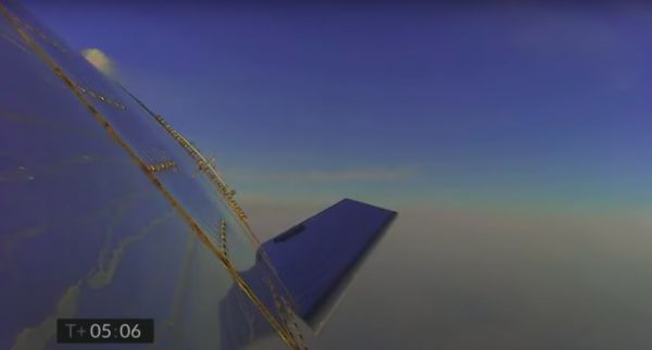 5 分钟之后,SN11 距离地面差不多 5 公里时,一台外部机载摄像机还拍下 SN11 在云层上方拍打襟翼的画面。