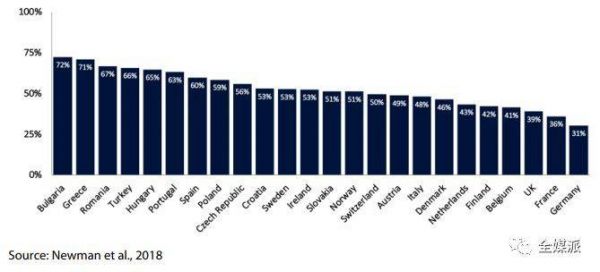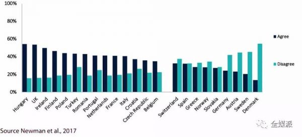 例如在英国,48%的受访者选择BBC作为主要新闻来源。在瑞典、德国、丹麦等国家,公共广播电视也是30%以上受访者的最主要新闻来源。