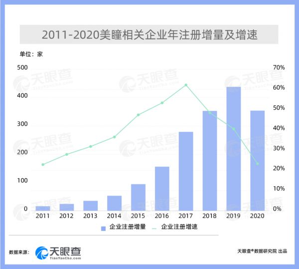 社交媒体和电商平台的快速发展则进一步扩大了美瞳消费市场,美瞳消费热潮迅速袭来。天猫国际数据显示,美瞳类商品在2020年“双11”成交同比超3位数增长,首小时成交超2019年“双11”全天。值得注意的是,近43%的美瞳相关企业涉及消费生活领域。