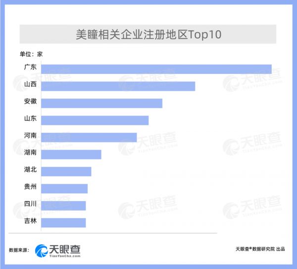 天眼查专业版数据显示,我国现有超过1,500家美瞳相关企业。从地域分布来看,广东拥有数量最多的美瞳相关企业,超250家。同时,山西、安徽、山东、河南四省均有超过100家美瞳相关企业。