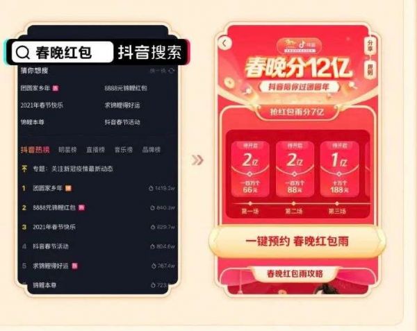 2021年春节,抖音临时接替拼多多,拿下春晚红包互动权。
