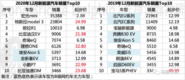 和2019年同期热销的新能源车型相比: