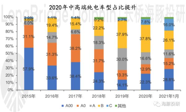 2020年火爆的新能源车市场其实主要是路径一的体现。2020年上市爆款车型包括特斯拉毛豆3、比亚迪汉、五菱宏光mini ev、长城欧拉R1、小鹏P7、蔚来EC6、理想One等,其中毛豆3、比亚迪汉和宏光mini ev都是月销过万的车型。