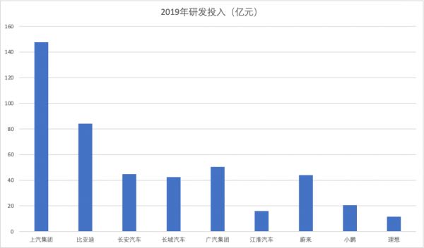 虽然汽车市场已现萎缩之势,但车企在研发中的投入依然巨大。2019年,包括上汽集团、比亚迪、长安、长城、广汽集团、江淮汽车在内的六家上市车企(集团)研发投入总和为385.6亿元,即使在深受疫情冲击的2020年,这六家上市车企(集团)上半年研发投入总和也达到了118.75亿元。在未受疫情影响的2019年中,投入最多的上汽集团,研发投入合计147亿余元,投入最少的江淮也投入了16亿。
