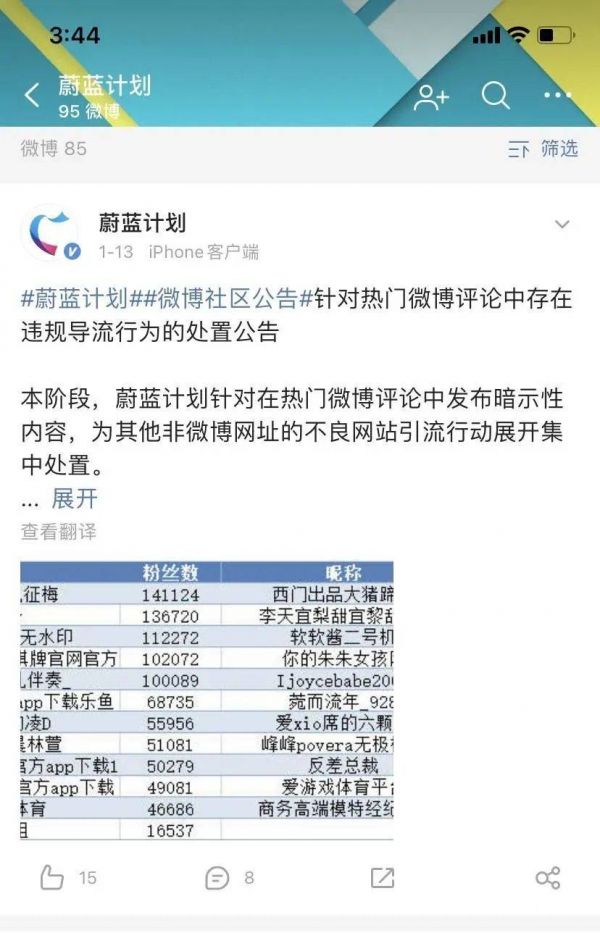 针对违规导流,微博推出了专项“蔚蓝计划”,处理相应账号和内容