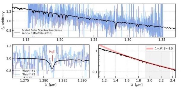 新发现的“闪光”,具有和太阳光谱一致的特征谱线(左下图中的Paβ线),因此是人造卫星反射太阳光的概率很高丨SteinHardt et al. 2021