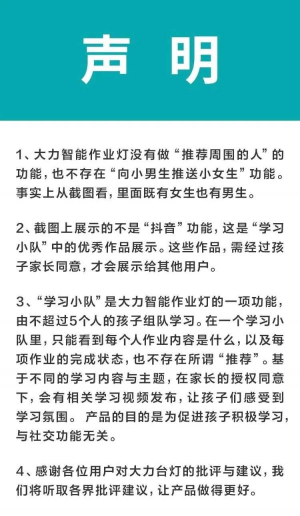 不过,大力智能台灯通过官方渠道很快回应称,并未推出此功能,这些视频只是优秀的学习作品展示。“基于不同的学习内容与主体,在家长的授权同意下,会有相关学习视频发布,让孩子们感受到学习氛围。”