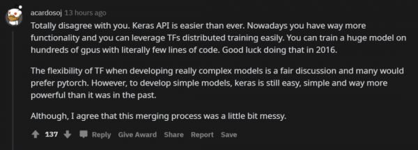 对于 Keras 和 TensorFlow 来说,二者的合并似乎是一个双赢的决定,但很多开发者不这么认为。上述发帖者就是其中之一。