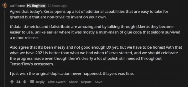 用户名为「carlthome」的开发者也认为,今天的 Keras 的确增加了很多功能,tf.data、tf.metrics 和 tf.distribute 也因为 tf.keras 的存在而变得更易用。因此他认为,尽管 TensorFlow 的生态系统还需要改善,我们也不应该忽视这些年取得的进步。