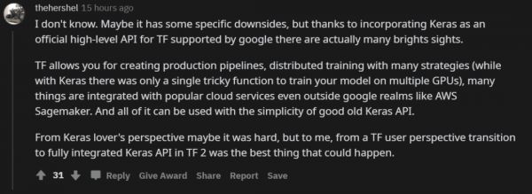甚至有位 TF 的用户表示,从 TF 转向完全集成了 Keras API 的 TF 2 是一个最好的选择。