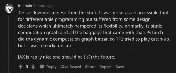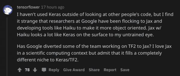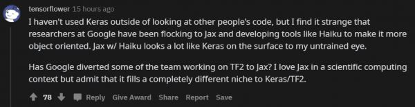 虽然很多人表示,Keras 和 TF 的结合确实带来了一些改进,但他们也承认,现在整个的 TensorFlow 以及它与 Keras 的合并都很混乱。既然如此,谷歌的团队为什么不多花点工夫梳理一下呢?有些开发者认为,这可能是因为,谷歌的很多人都去开发 Jax 了。