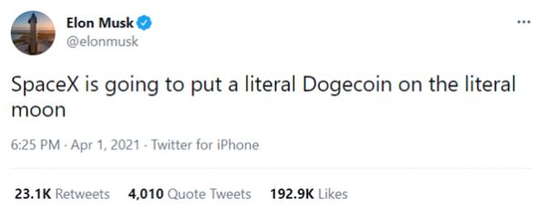 北京时间4月1日下午6点半左右,特斯拉CEO埃隆·马斯克在自己的个人推特账户上说:“SpaceX将把一枚狗狗币送到月球上”。