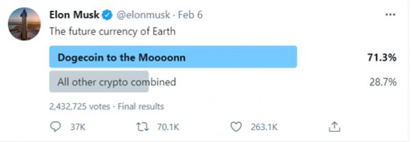2月6日,马斯克又在推特上发起投票:“你希望用什么做地球未来的货币”,截至目前,已有超240万人参与投票。其中71.3%的网友选择用狗狗币做未来的货币,28.7%的人选择了其他货币。