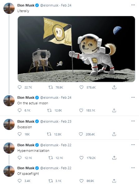 2月24日,马斯克又连发5条与狗狗币有关的推文,暗示将把狗狗币放到月球上。