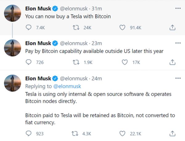 除了狗狗币,马斯克也常为比特币站台。就在上周三,马斯克连发三条推特,宣布美国市场已可用比特币购买特斯拉汽车,而美国之外的市场也将于今年晚些时候接受比特币支付。