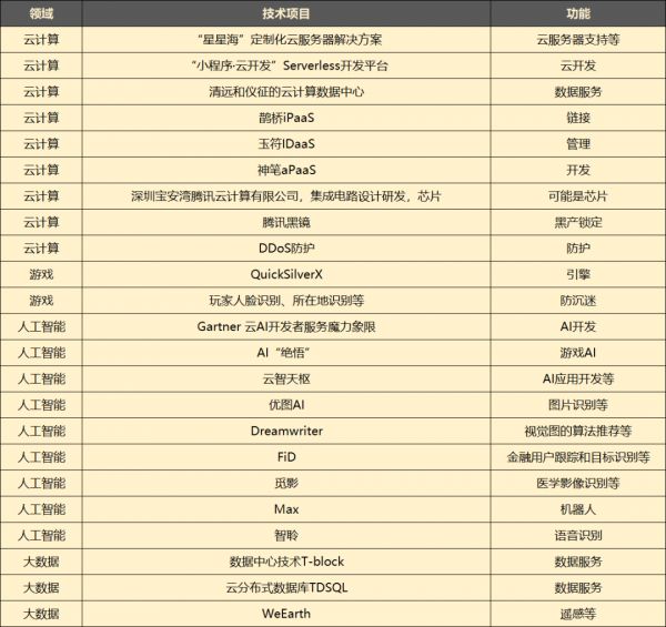 到2021年,腾讯已有商用的技术服务已经从线上、软件延伸到了卫星、芯片等更上游的领域,并且可以实现同一项目里,多项技术服务的一条龙应用。
