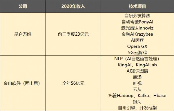 金山软件和昆仑万维近几年技术项目