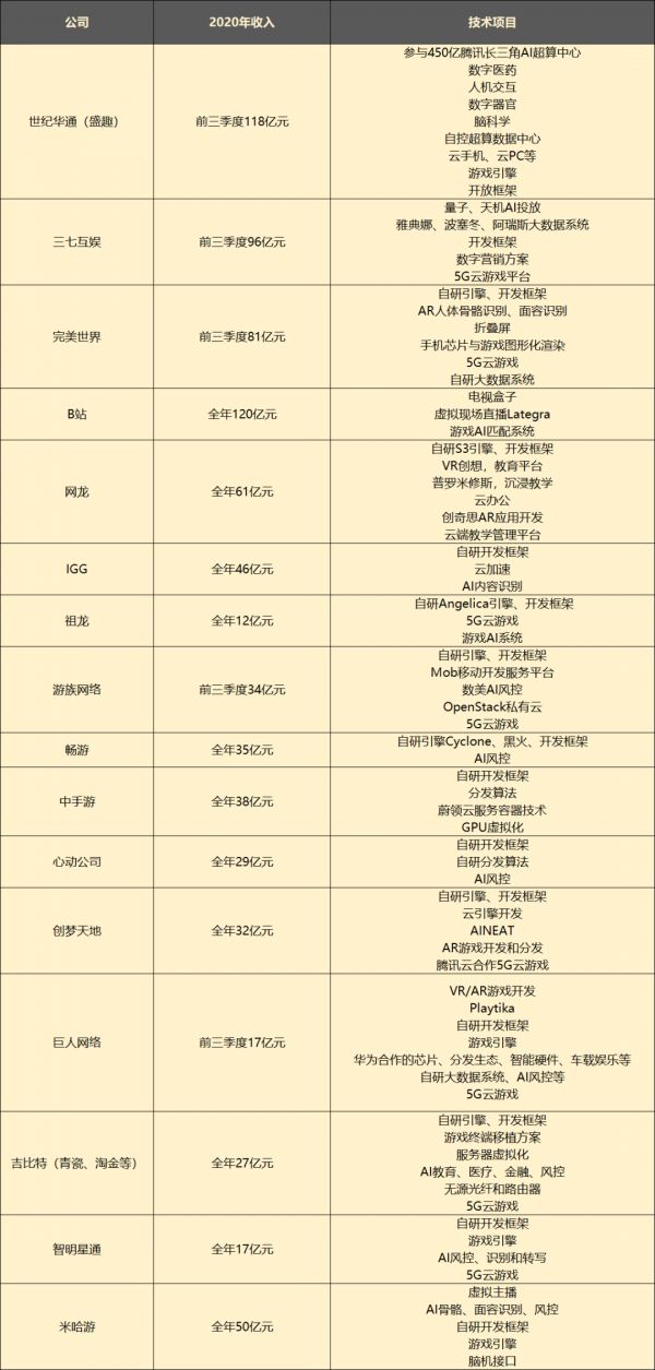 更纯粹的游戏商,技术布局主要集中在游戏引擎和开发框架,以及其他能直接应用到游戏开发、发行商的技术,比如能直接对接游戏的云储存、启动、和游戏AI等。