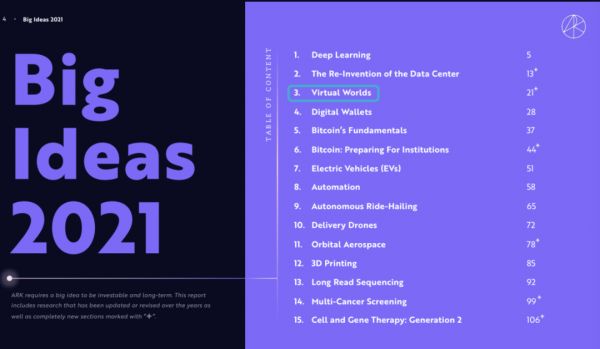 今年2月,因重仓特斯拉而实现惊人业绩的投资公司ARK Investment Management(以下简称ARK)在2021年度投资报告中提出了15个宏大而前景广阔的投资主题。其中之一,便是由虚拟世界联结而成的元宇宙。