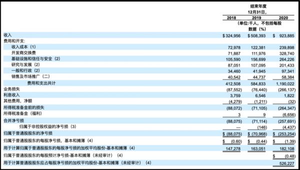 据Roblox招股书显示,2018年、2019年、2020年营收分别为3.25亿美元、5.08亿美元、9.24亿美元。虽然收入持续上涨,但是亏损也在不断扩大。报告期内,其净亏损分别为8810万美元、7100万美元和2.533亿美元;运营亏损达8755万美元、7644万美元、2.66亿美元。