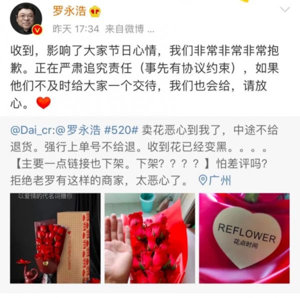 第一次遭遇大面积投诉,是去年的情人节期间,交个朋友直播售出的鲜花出现严重的商品和售后问题。于是罗永浩专门派选品经理到天津仓库考察,发现的确如此。结果一口气就赔进去一百多万。这被称为“520鲜花事件”。