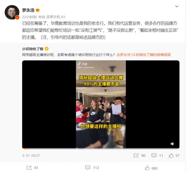 除此之外,罗永浩还打算做主播培训。3月31日,他发微博称,已经在筹备了,毕竟教育培训也是我的老本行。我们有代运营业务,很多合作的品牌方都迫切希望我们能帮忙培训一批“没有江湖气”,“路子没那么野”,“看起来相对端庄正派”的主播。(注,引号内的话都是转述品牌方的)