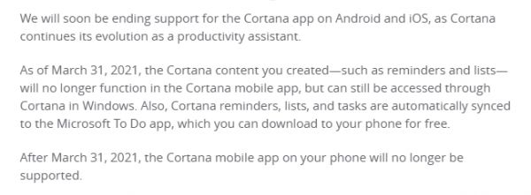 公告原文称:“我们很快就会停止对 Android 和 iOS 上的 Cortana 应用程序的支持,因为 Cortana 将继续发展成为一名生产力助手。截止到 2021 年 3 月 31 日,你创建的 Cortana 内容如提醒和列表等,将不再在 Cortana 移动应用程序中发挥作用,但仍然可以通过 Windows 上的 Cortana 访问。此外,Cortana 的提醒、列表和任务会自动同步到微软的 To Do 应用程序,你可以免费下载到手机上。2021 年 3 月 31 日之后,您手机上的小娜 App 将不再被支持。”