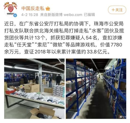 4月2日,全国打击走私综合治理办公室官方微博“中国反走私”发布消息称,近日,在广东省公安厅打私局的协调下,珠海市公安局联合拱北海关缉私局打掉走私“水客”团伙及揽货团伙等共计13个,抓获犯罪嫌疑人54名,查扣涉嫌走私的“任天堂”、“索尼”和“微软”等品牌游戏机,价值7780余万元,查证2018年以来累计案值约33.8亿元。