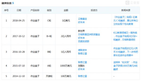2014年7月,原因脉科技创始人、互联网连续创业者刘夜,百度前战略合作部总经理王克,英特尔前中国区教育负责人贾晓明联合创立了作业盒子。其创立之初便获得了联想之星100万美元的天使投资,公司核心研发、运营团队主要来自于百度、阿里。随后,作业盒子分别获得了贝塔斯曼、云锋基金、百度风投、联想之星、德联资本等多家知名机构的资本加持,也间接验证了彼时刚成为投资人的章泽天眼光独到。