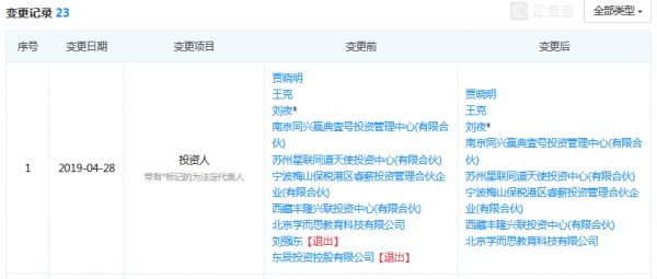 4月29日消息,据企查查数据显示,“作业盒子”主体公司北京知识印象科技有限公司(下称“知识印象”)发生股东变更,刘强东以及其控股公司东辰投资控股有限公司(下称东辰投资)退出股东行列。