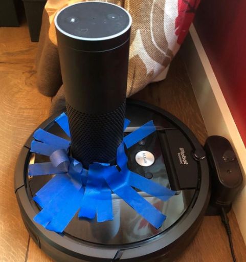 后来亚马逊CEO 贝索斯在个人的Instagram上发布了这样一张图片:一个Alexa音箱被用胶带贴在了一个扫地机器人上。