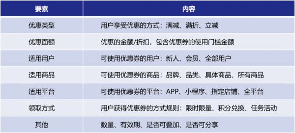 优惠券作为广泛使用的营销工具,其具有一些关键的组成要素,这些要素组成了最终发放给用户的优惠券,拆分来看这些要素能帮助我们更好了解和使用优惠券。