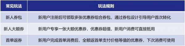优惠券是引导新用户完成首单转化和前期留存的有效工具,将优惠券包装为新人专属权益,进一步提升优惠券的价值,提升使用率。