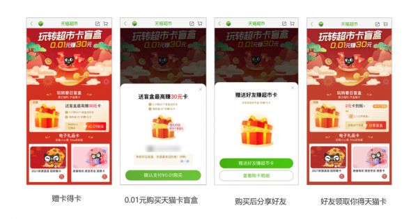 在天猫超市的超市卡玩法中,超市卡就是天猫超市内的一种优惠券形式。老用户支付0.01元购买30个超市卡盲盒,再将超市卡盲盒分享给好友,每一个好友领取1个超市卡盲盒,老用户就可获得1元超市卡,30个盲盒都被好友领取后,老用户就可获得30元天猫卡,0.01元最多赚到30元,老用户的参与动机较高,并且新用户也可以随机领到不同额度的超市卡,承接其后续的转化消费。盲盒的概念和玩法也较为新颖,提升了玩法的趣味性。