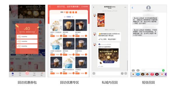 瑞幸咖啡就非常擅长利用优惠券进行用户唤醒召回,长期未消费和访问的用户回访时有回访优惠券包和优惠专区,沉默用户也有多渠道多轮次的优惠券召回,共同减少用户的流失。