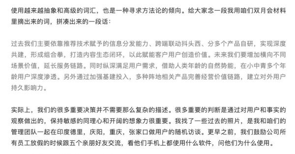此外还有一些不明显的体现,比如张一鸣连续两年提了“理性的自负”这个概念,其来源于知名的经济学家哈耶克,张一鸣去年借此思考的是企业管理中的信息透明,今年则是借此来说明“不依赖捷径,少用杠杆”。