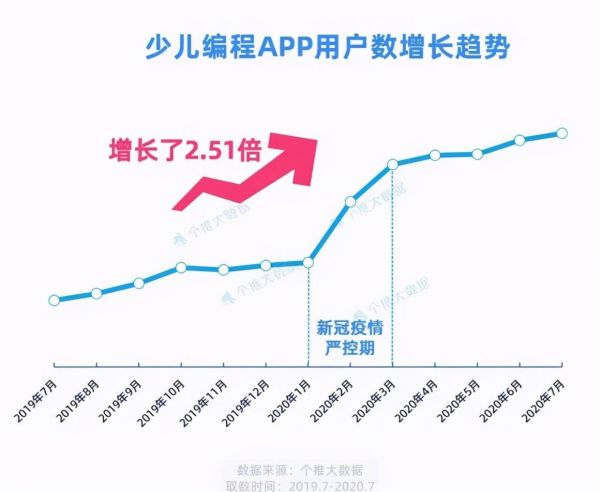 而据个推大数据分析,少儿编程APP用户数持续增长,截至2020年7月,少儿编程APP用户数较2019年同期增长了2.51倍。