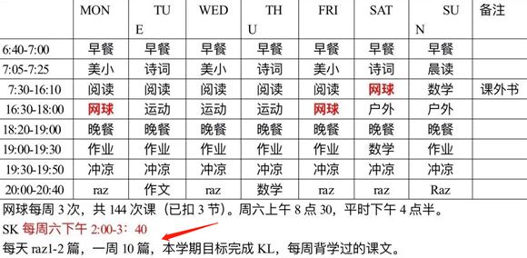 早上七点开始阅读,随后进行美术、数学、作文、阅读英语书籍等项目,直到晚上八点结束。