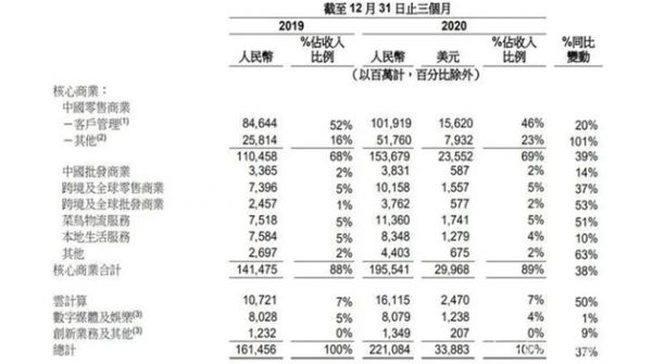 在几大主力业务中,核心电商营收达到1955.41亿元,同比增长38%,占整体收入占比89%;云计算营收161.15亿元,同比增长50%,整体占比达到7%;数据媒体及娱乐业务(阿里大文娱)营收80.79亿元,同比增长1%,整体占比达到4%;创新业务营收13.49亿元,占比不足1%。