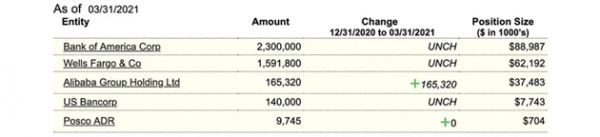 截至2021年第一季度,Daily Journal持有5只股票,总价值1.97亿美元。除阿里巴巴外,该公司还持有富国银行、美国银行、浦项制铁和美国合众银行的股份,这些持仓自2020年底以来一直没有变化。