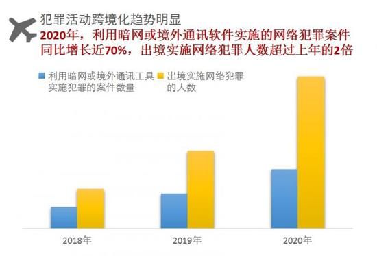 暗网和境外通讯软件在网络犯罪中的应用明显增多,2020年检察机关办理利用暗网或境外通讯软件实施的网络犯罪案件同比增长近70%,出境实施网络犯罪的人数超过上一年的2倍。