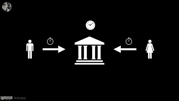 现在,如果没有银行,会发生什么?谁来决定谁是第一个刷卡的人?如果不仅仅是你们两个人,而是几百甚至上千人在协调呢?如果你不信任那些人呢?如果其中有些人想作弊,比如把时钟调回原点,让人觉得他们提前几分钟花了钱,那会怎么样?