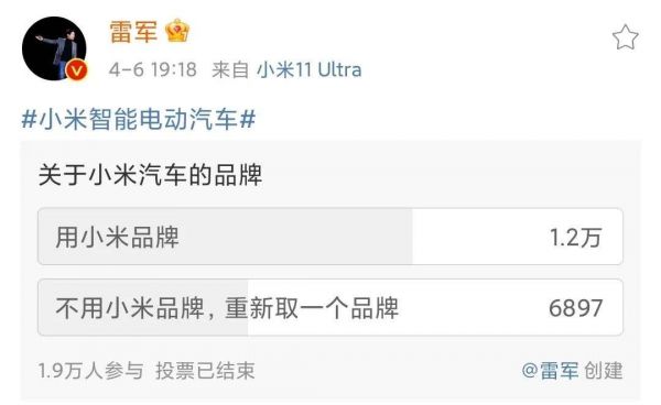 但据雷军介绍,他在直播前发布了粉丝投票,有关小米汽车的品牌,共有1.9万名网友投票,投票结果显示,有1.2万人希望小米继续使用“小米”作为汽车品牌,6897人希望重新成立品牌造车。
