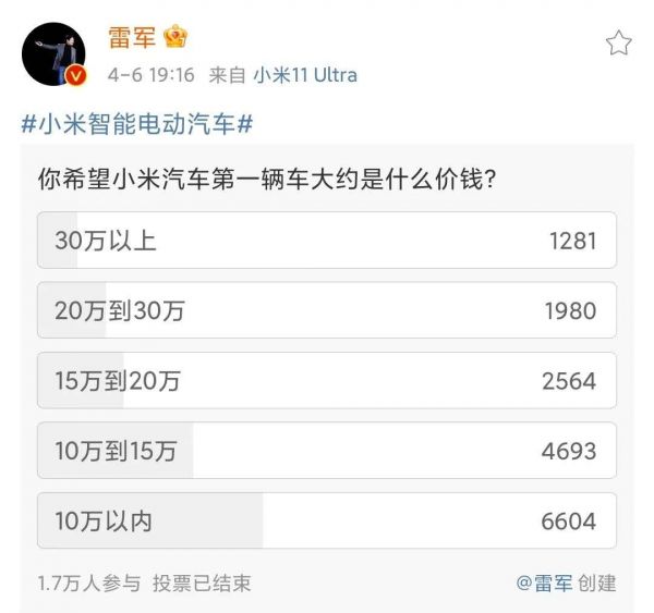 在定价方面,雷军同样以米粉投票结果作答。据他介绍,选择10万元以下的粉丝最多,其次就是10-15万元,15-20万元和20-30万元的支持人数分列其后,30万元以上只有1281人投票。