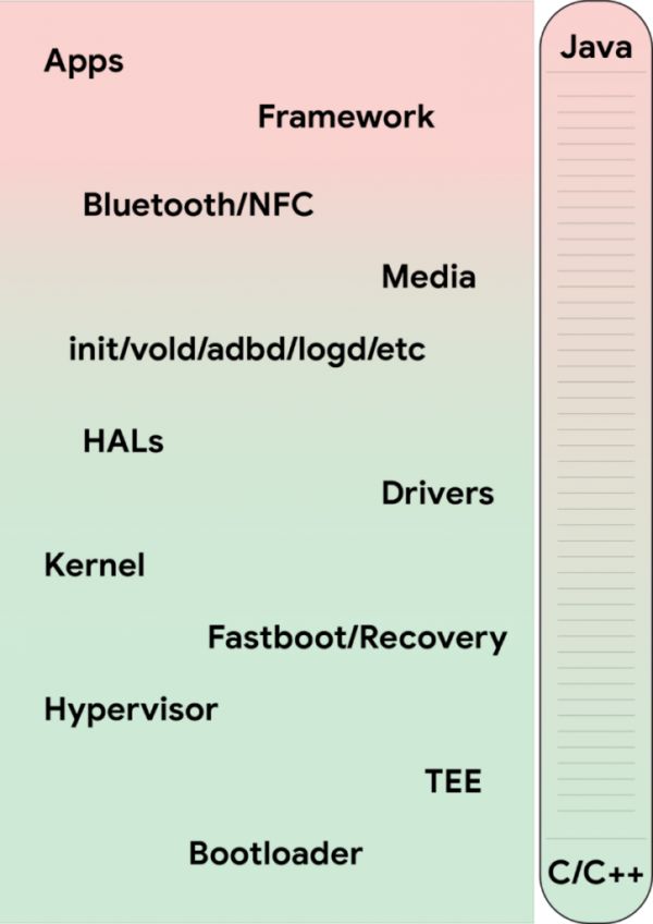 C和C++构成了Android平台上数千万行代码,这使得一旦发生内存安全漏洞,就形成最难以解决的代码错误来源,占Android高严重度安全漏洞的70%左右。所以与其事后再解决这些Bug,不如从一开始就预防。