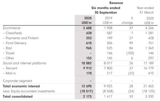 2020年11月,Prosus发布截至2020年9月30日的半年报。即便在疫情的影响下,公司在腾讯业绩的加持下仍然交出了核心营收增长29%的亮眼数据。