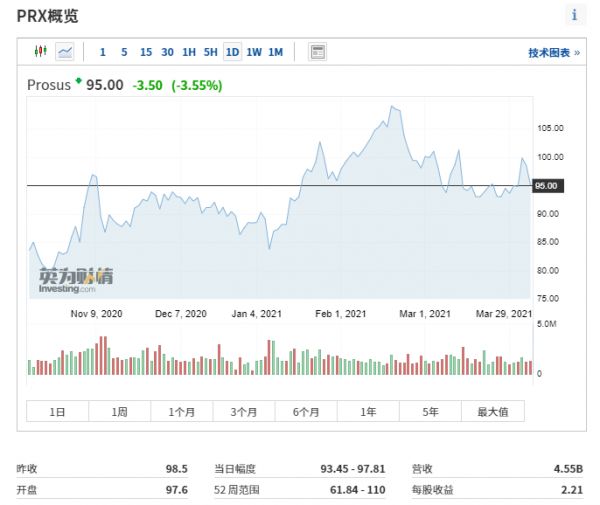截止发稿,Prosus在阿姆斯特丹上市的股票下跌3.55%。