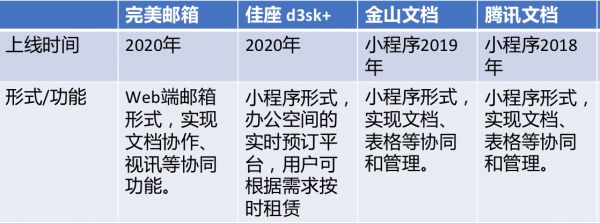 金山文档的用户群体结合了以上三派。其用户中的60%是来自传统制造业和电商用户。这些用户通过金山文档小程序中的表格功能等进行生产任务的管理、承接。其使用习惯是,更偏向使用QQ、微信来进行沟通,并且也很难申请到钉钉和企业微信的认证。在QQ、微信等个人沟通工具和企业微信、钉钉等企业IM之间,就是金山文档这类协作工具的机会。